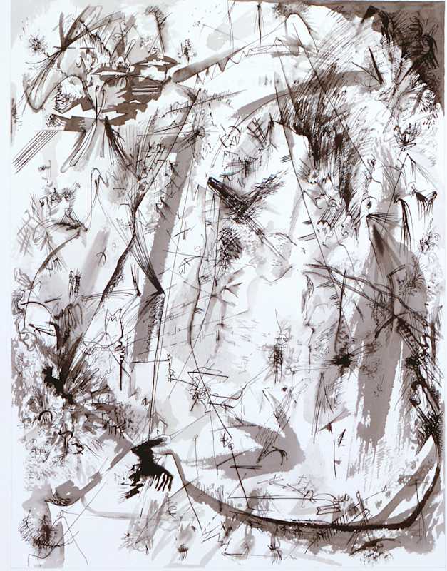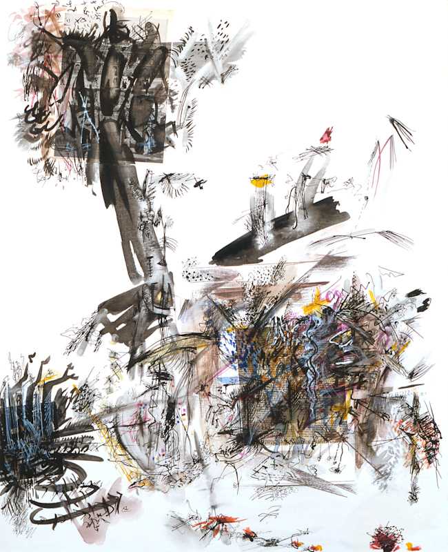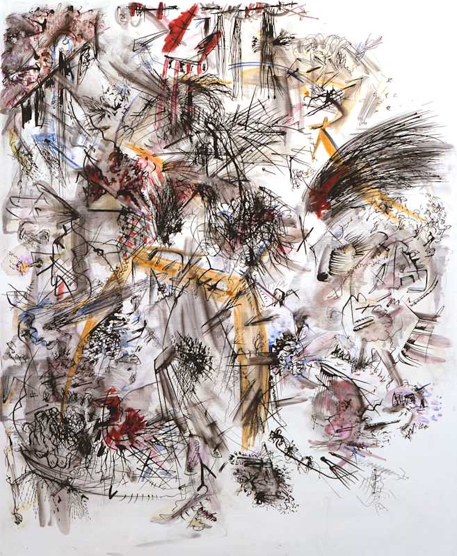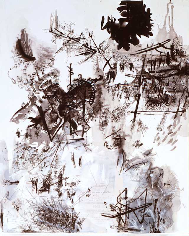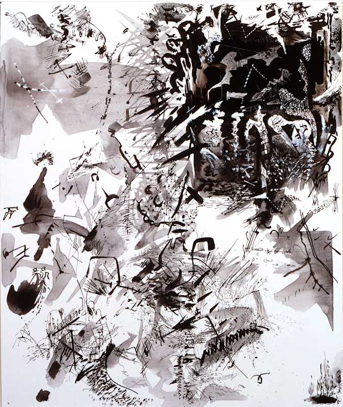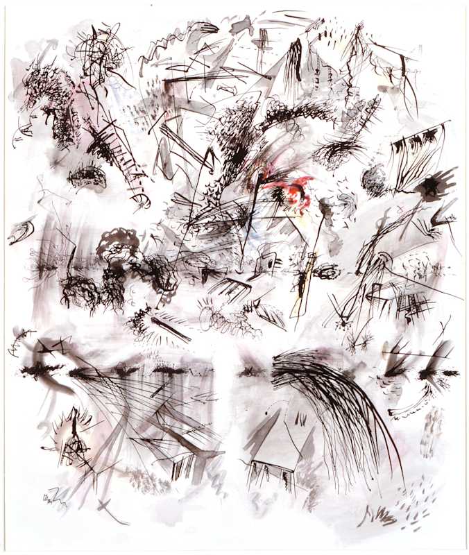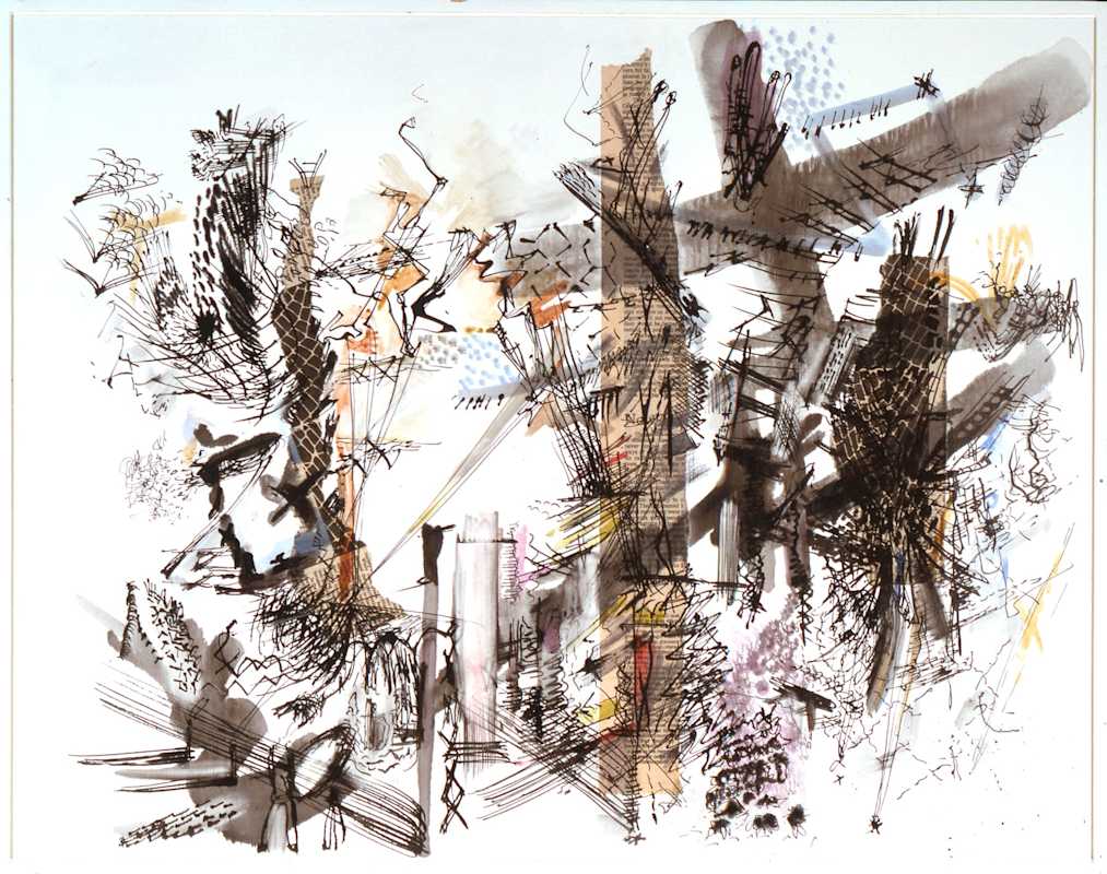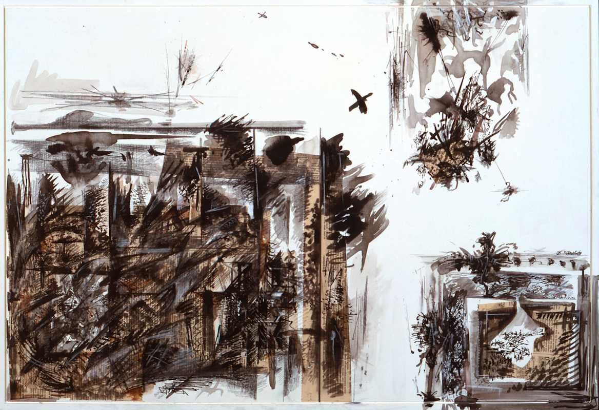 “That’s a beautiful thought,” Libeskind replied. “These drawings were made such a long time ago, that the thought for me too is in the images, and what you have now said is relevant because then, just as now, I believed that what we control is not the truth; it is not reliable. The reality is completely elsewhere, exactly in the realms that we are now exposed to. It is the piece of our mind that is not controllable and these elements penetrate through and into the drawings or paintings, between the gestures of making. It’s strange now, meeting up with these thoughts that were not really around at that time [in 1983-5] because then everything was getting brighter and progressing, everything was getting more and more consumed and optimistic; so these drawings were on the other side of the moon, the side that we don’t see at all.”